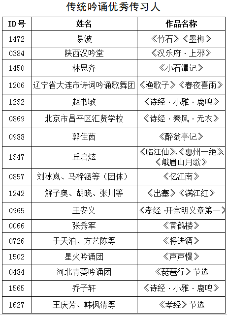 山西省河东吟诵社、山东省尼山书院吟诵学社、北京市教育学会吟诵教育研究会、四川省吟诵学会、唐山孔子学堂推广指导委员会、固镇县吟诵学会、大连市吟诵学会、鹤岗市吟咏诵读文艺家协会、湖北襄阳市吟诵学会、西安市吟诵学会、湖南吟诵学会、福建省吟诵学会、北京市昌平区汇贤学校、浙江温州市吟诵学会、唐山市吟诵协会、广东省惠州市吟诵协会、湖南长沙红卫小学、佛山市顺德区美的学校、河南省濮阳吟诵学会、河南省吟诵学会、云南省曲靖市吟诵协会、襄阳市传统文化教育研究会、贵阳蒙正学堂、广东省汕头市龙湖实验中学、山东冠县二小孔子学堂、山东泰山职业技术学院、上海市市北中学、济南市莱芜区花园学校孔子学堂、陕西省宝鸡孔子学堂推广委员会、连海书院、明道堂经学馆、山西新绛西街北校、山西临猗棒棒堂教育学校、山西运城市蓝海小学、河东吟诵社太原基地、太原交通广播华伊读书会、河东吟诵社河津基地、运城市解放路第三小学、运城市新康国际学校、日照市金海岸小学