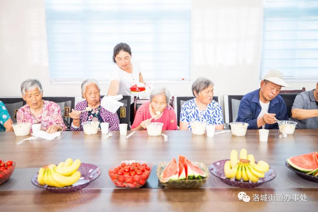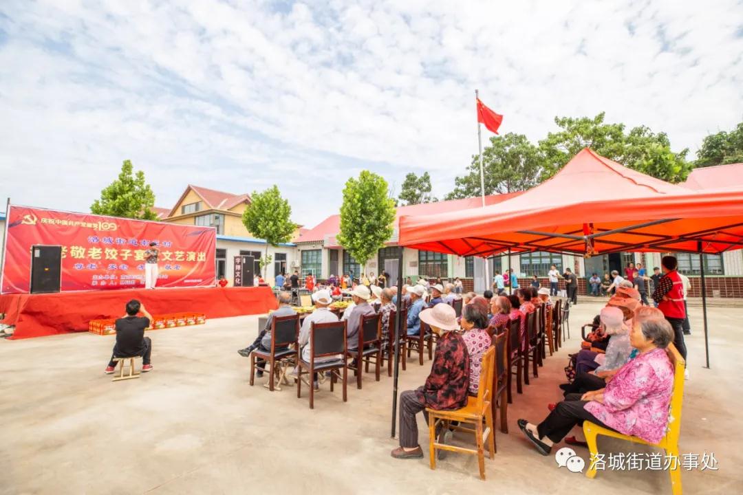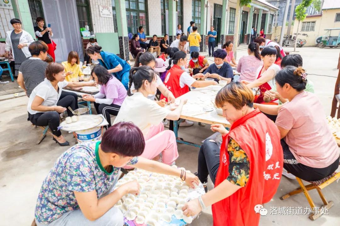 6月18日上午,在洛城街道南范村村委大院里,老人们吃着水果,看着节目。村里的志愿者包饺子,为老人们准备礼物。整个大院里欢声笑语,其乐融融。