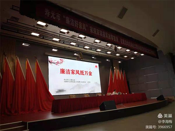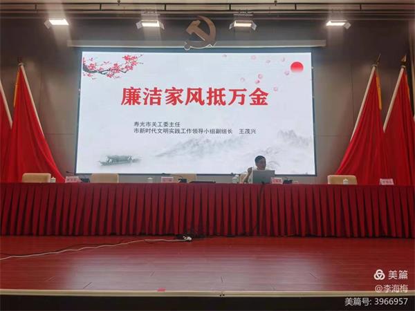 为深入推进党史学习教育,让优良家风涵养廉政文化,营造以家风带党风促政风的良好氛围,7月10日,寿光市纪律检查委员会机关、市委宣传部、市关心下一代工作委员会、市委市直机关工作委员会、市妇女联合会共同启动“廉洁好家风”宣讲,市委副书记王霞对“廉洁好家风”宣讲和传统文化弘扬提出了要求。