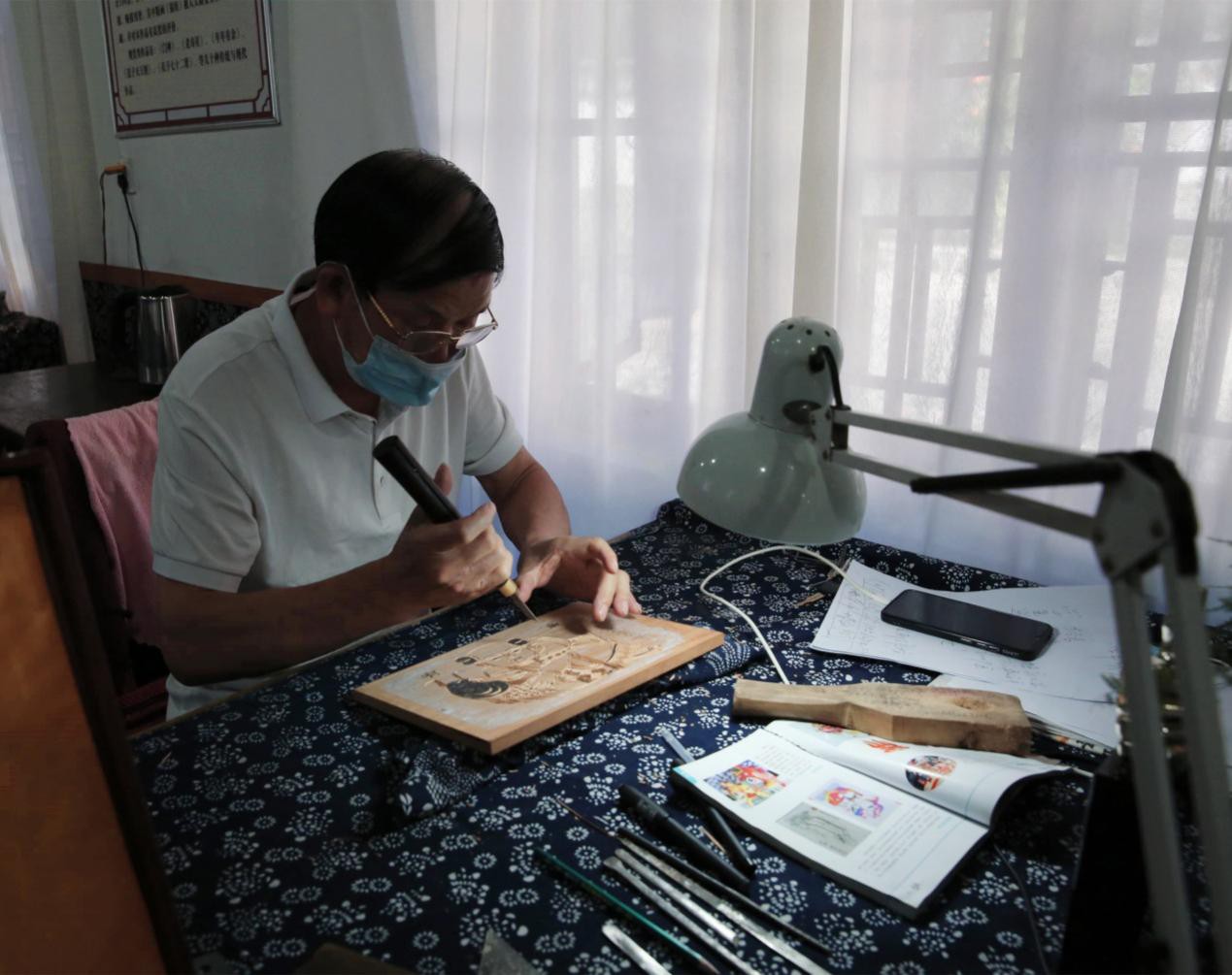 민간 예술의 대가 얜커천(顏克臣)이 대관원 안에서 옛 조각판 기예를 시연하고 있다.