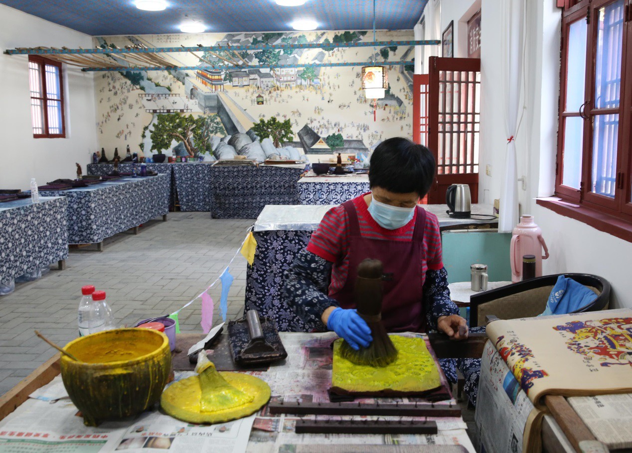 공예 미술의 대가 양메이제(楊美潔)가 대관원 내에서 세화 인쇄 공예를 시연하고 있다.