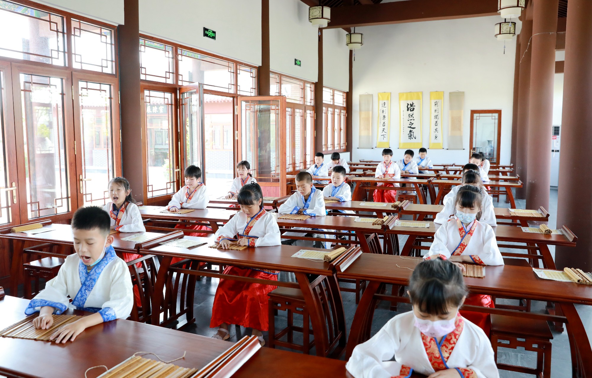 “首孝悌,次谨信。泛爱众,而亲仁。”书院里传来稚童朗朗的诵读声,声音来自书院内的习儒馆,身着汉服的孩子们端坐于书桌前,手捧竹简,朗读《弟子规》,书香阵阵中育学子儒雅风范,让学生感受儒家教育“兴于诗,立于礼,成于乐”的传统文化之美。