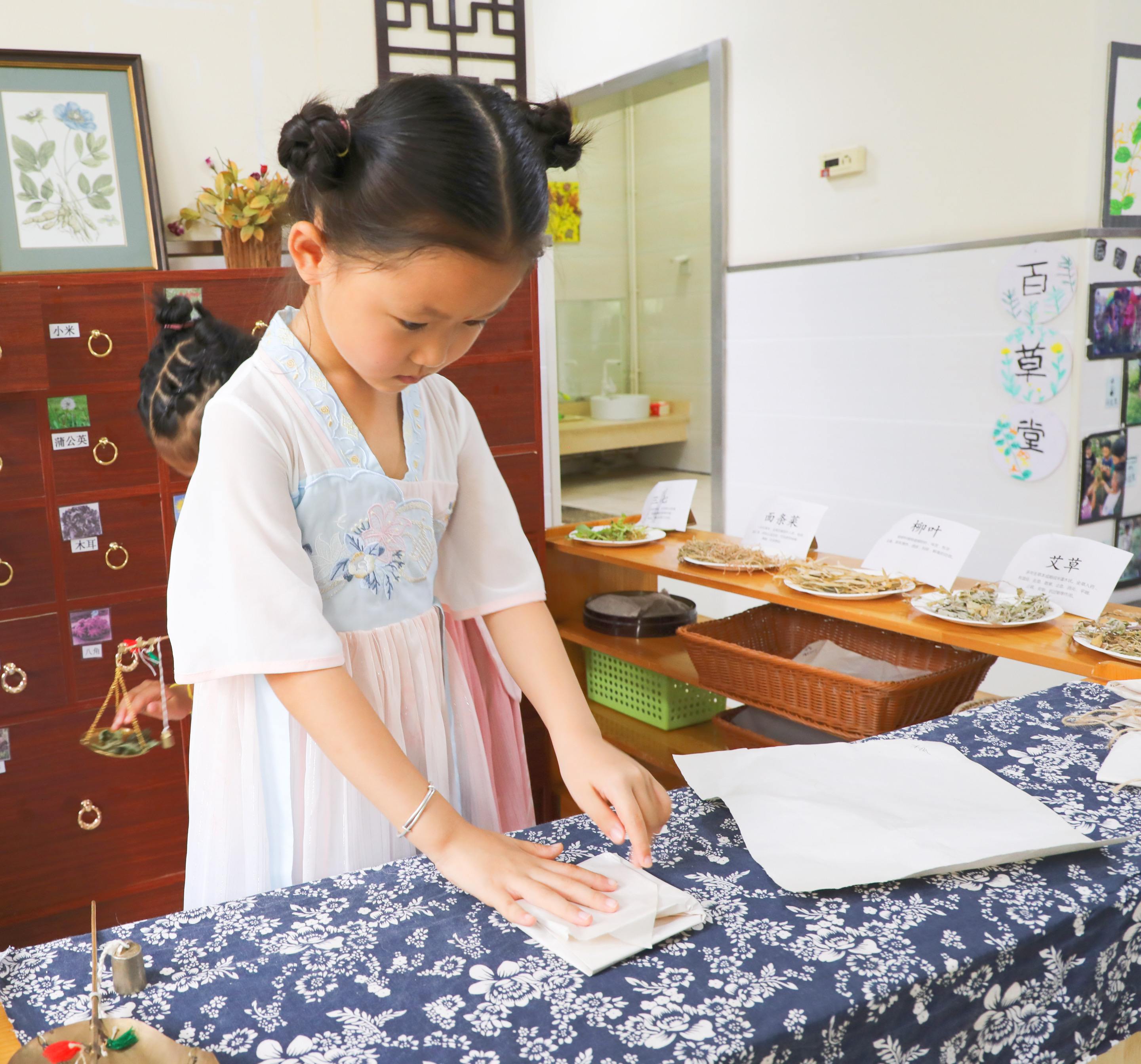 进入百草堂中医药体验馆,碾药、制作标本、制作中草药香包、品尝自己炮制的茶饮,在游戏中感知问诊、抓药等体验、研究活动丰富多彩。在寓教于乐中,孩子们对中医药产生浓厚兴趣。