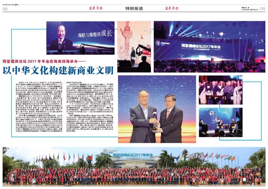 本次博鳌儒商论坛2017年年会上,由博鳌儒商论坛理事长黎红雷主编的《企业儒学 2017》进行了新书发布,黎红雷在书中写道:企业儒学,是儒学思想在现代企业中的应用与发展,它将儒家的治国理念转化为现代企业的治理哲学,以儒学之道驾御现代管理科学之术,不但解决了企业自身的经营管理问题,而且为儒学在当代的复兴开拓了新的途径。服 儒学的当代中国企业家,尊敬儒家先师孔子,承担儒家历史使命,践行儒家管理理念,秉承儒家经营哲学,弘扬儒家伦理精神,履行儒家社会责任等方面,对企业儒学进行了积极的探索。