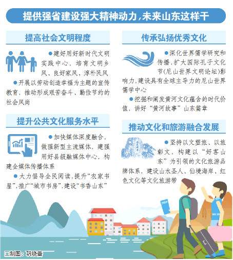 《中共山东省委关于制定山东省国民经济和社会发展第十四个五年规划和二〇三五年远景目标的建议》(以下简称《建议》)将“文化强省建设实现重大突破”摆在突出位置,提出“十四五”时期文化强省建设实现突破、塑成优势的目标任务:社会主义核心价值观融入经济社会发展各方面,优秀传统文化影响力显著提升,文物保护全面加强,公共文化服务体系更加健全,文化旅游业战略性支柱产业地位充分彰显,建成国际著名文化旅游目的地。