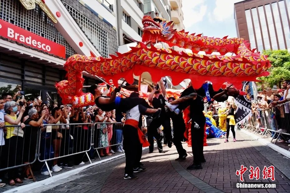 当地时间2024年2月24日,正值农历甲辰龙年元宵,第十九届欢乐春节游园会在巴西最大城市圣保罗启幕,吸引数万民众同闹元宵。图为舞龙演员们叠罗汉炫技。中新社记者 林春茵 摄