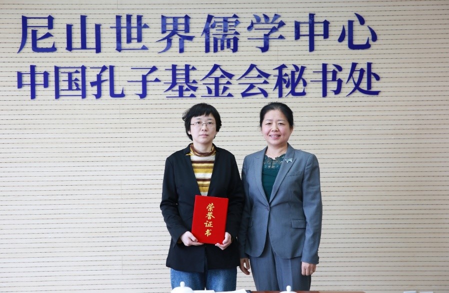 尼山世界儒学中心党委书记、副主任国承彦为张白同志颁发“建言献策优秀个人”荣誉证书