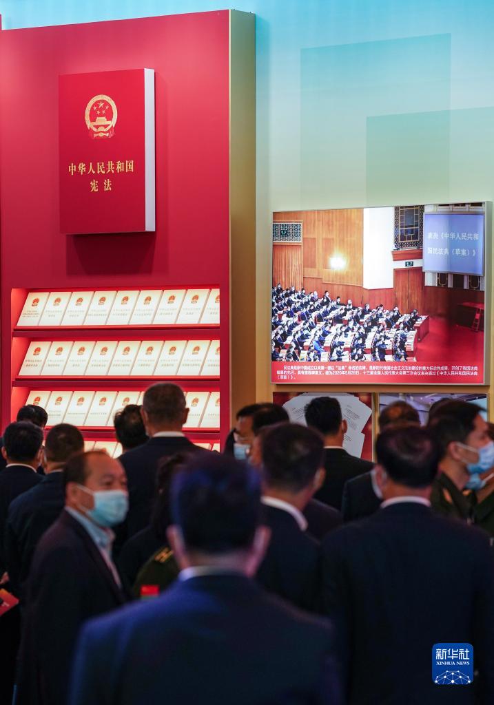 庄重肃穆的法律展示区,大幅宪法图标居于最高位置,党的十八大以来新制定的部分法律法规依次陈列,象征着以宪法为核心的中国特色社会主义法律体系不断完善。