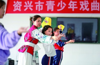 在湖南省资兴市鲤鱼江完小,戏曲老师指导学生学习戏曲基本动作。新华社发