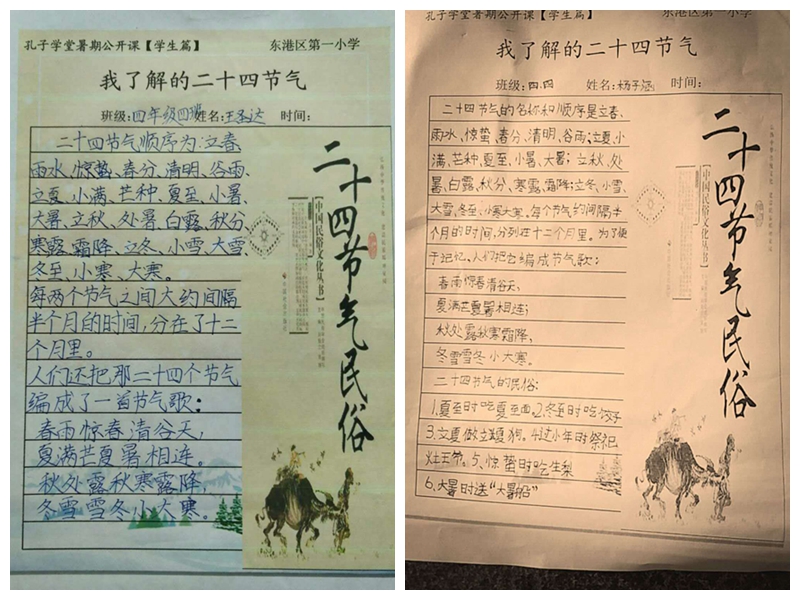 “二十四节气”是我们在现实生活中经常接触到的民俗文化,传统文化的普及和传承更应该从“从娃娃抓起”,青少年一代将成为弘扬传统文化的未来中坚力量。此次公开课,得到了全国各地孔子学堂、中小学校、传统文化培训机构的热烈响应与支持,他们积极组织学生、学员共同观看学习。日照市东港区第一小学等孔子学堂的小学生们看完后写下了心得与收获。公开课不仅极大地丰富了孩子们的暑期生活,让孩子们在快乐中不断汲取知识的养分,感受传统文化的魅力。
