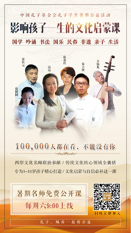 孔子学堂暑期名师公开课,是由中国孔子基金会孔子学堂推进委员会、中国孔子基金会网络传播中心于暑假期间面向全国中小学公益推出的一道文化大餐,旨在以公开课的形式,丰富学生们的假期生活,开拓文化视野,培育审美情操,为学堂人提供更丰富的精神食粮。