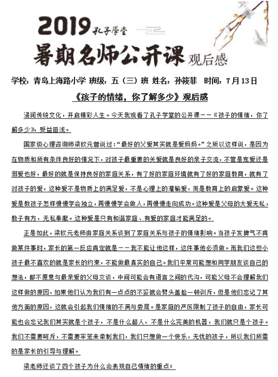 “知之,乐之,好之……”7月6日,2019孔子学堂暑期名师公开课正式开课,青岛上海路小学的孩子们跟随台湾大学哲学系教授傅佩荣走进“德不孤,必有邻”的《论语》世界;跟随梁钦元先生解析“亲子关系”中的“心理动因”,写下了一篇篇精彩体悟、感悟……