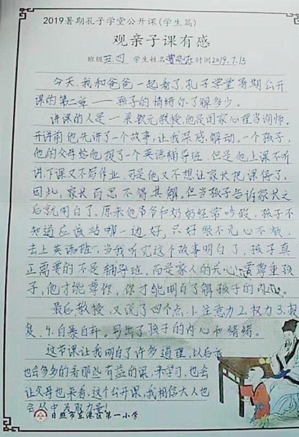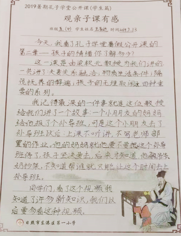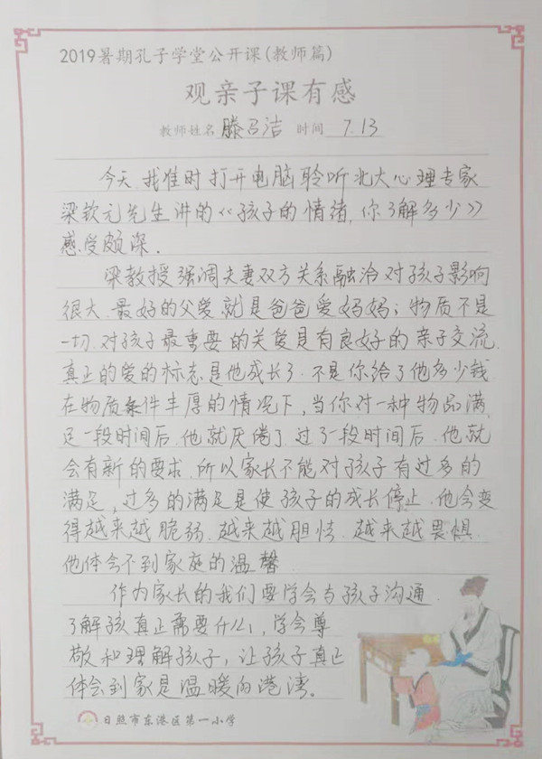 编:去年一别今夏见,今夏相见随心愿。2018年夏天,由中国孔子基金会主办的“孔子学堂暑期名师公开课”为广大国学爱好者带来一个完美的假期,山东省日照市东港区第一小学作为重要学堂单位,与暑期公开课“相知、相识”,积极组织师生观看课程、抒发感悟。今夏,2019孔子学堂暑期名师公开课再度上线,携带更丰富的课程内容、更优质的课程水准,与东港一小“不期而遇”、“久别重逢”。让我们一起聆听来自东港一小的观后感悟吧。