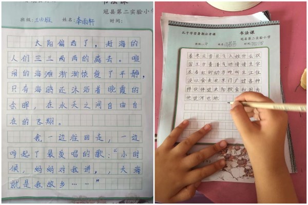 冠县第二实验小学的孩子们在学习“书法课”后,进行书法练习