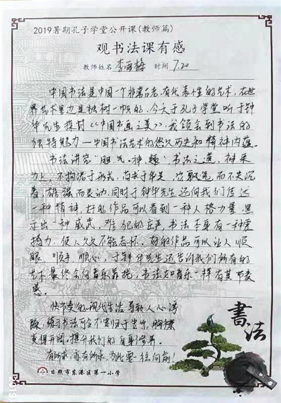 日照东港一小的老师也表示在课程结束后,将积极组织学生按照学习方法练习书法,将所学精华转化到实际练字中去,努力提高“笔头功夫”和“字外功”,向着更精湛的书艺不断进步。