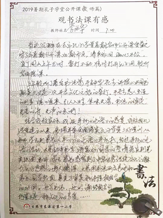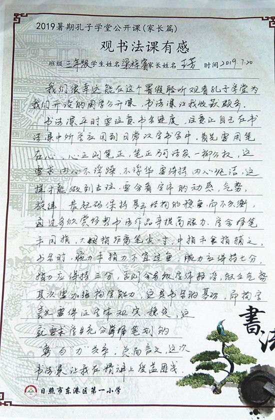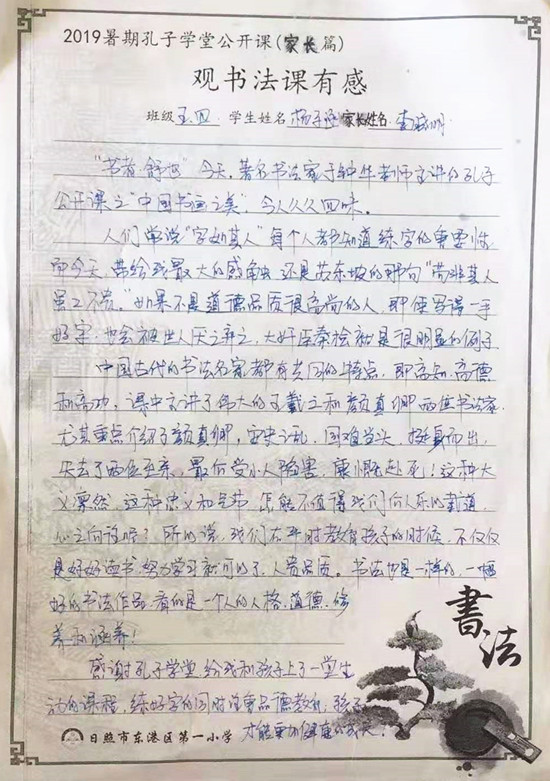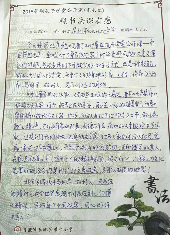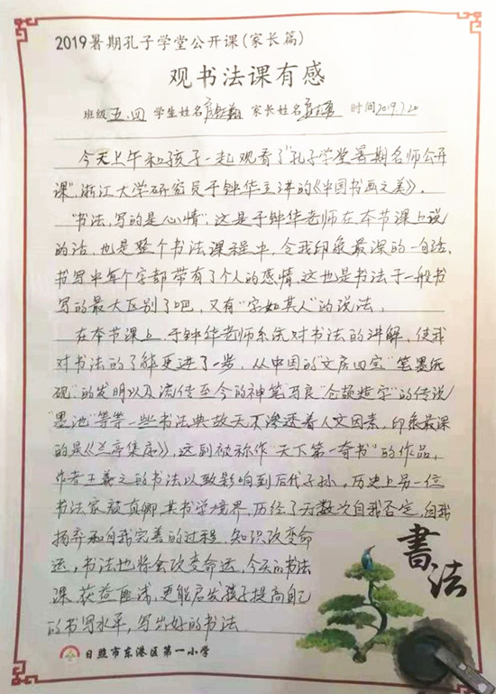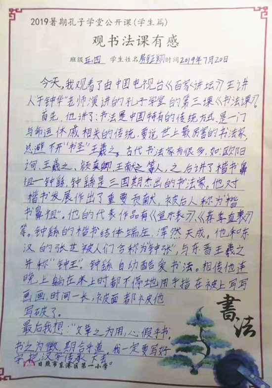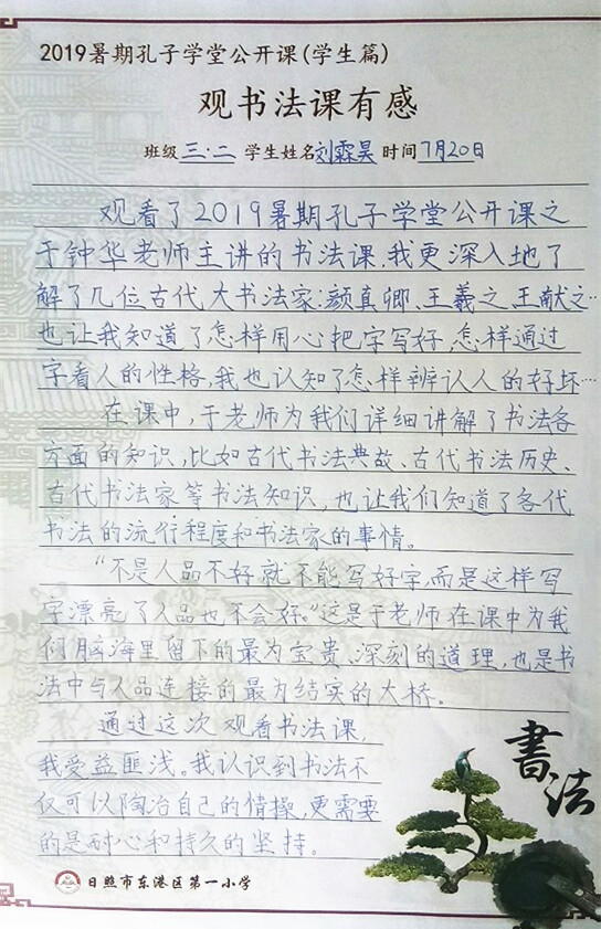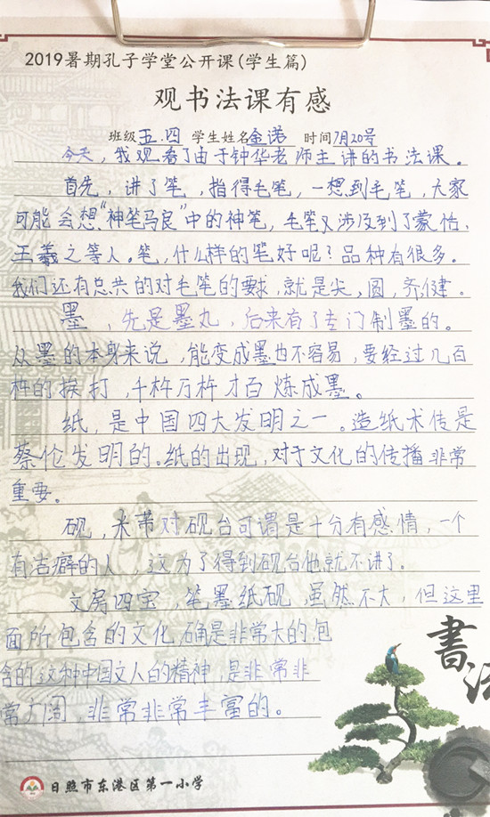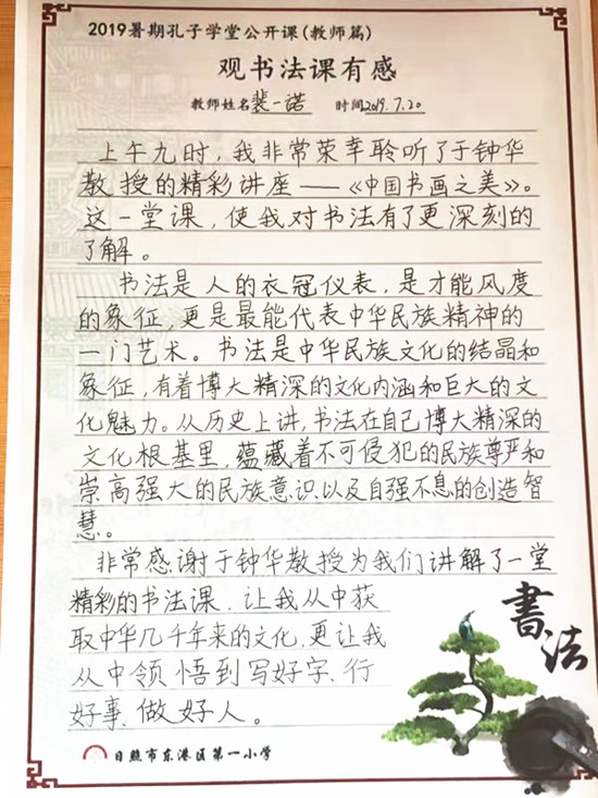 编:去年一别今夏见,今夏相见随心愿。2018年夏天,由中国孔子基金会主办的“孔子学堂暑期名师公开课”为广大国学爱好者带来一个完美的假期,山东省日照市东港区第一小学作为重要学堂单位,与暑期公开课“相知、相识”,积极组织师生观看课程、抒发感悟。今夏,2019孔子学堂暑期名师公开课再度上线,携带更丰富的课程内容、更优质的课程水准,与东港一小“不期而遇”、“久别重逢”。7月20日,书法家于钟华主讲的第三节“书法课”上线,让我们一起聆听来自东港一小的观后感悟吧。
