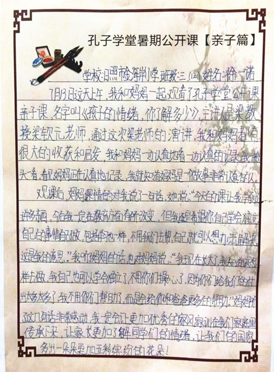 今天早晨,我和爸爸、妈妈一起观看了孔子学堂梁钦元先生的讲课,深入学习国学经典,受益匪浅。作为小学生的我们,虽然比幼儿时期更加独立也更有想法,但是还没有形成完整的世界观和价值观,所以无法面对校园和家庭外的风风雨雨,由此以来爸爸妈妈给我营造的温室就格外珍贵。