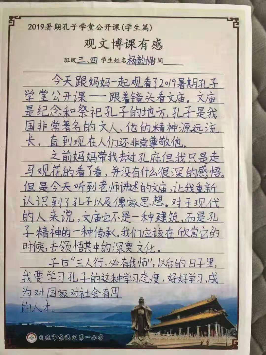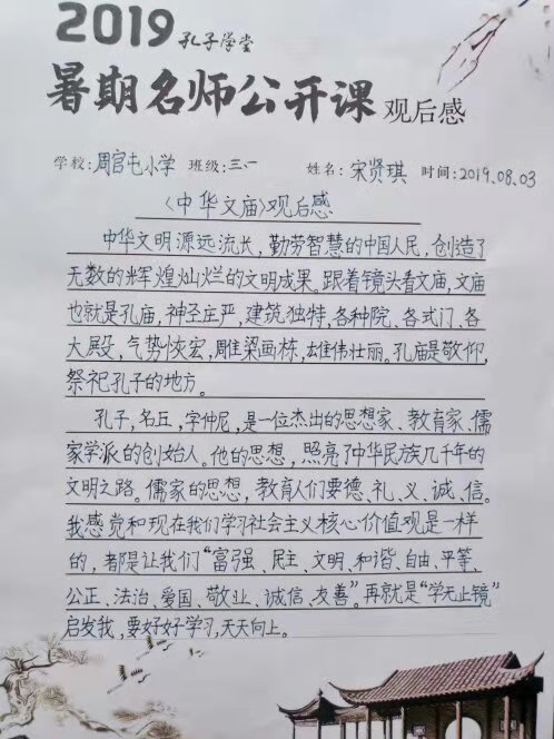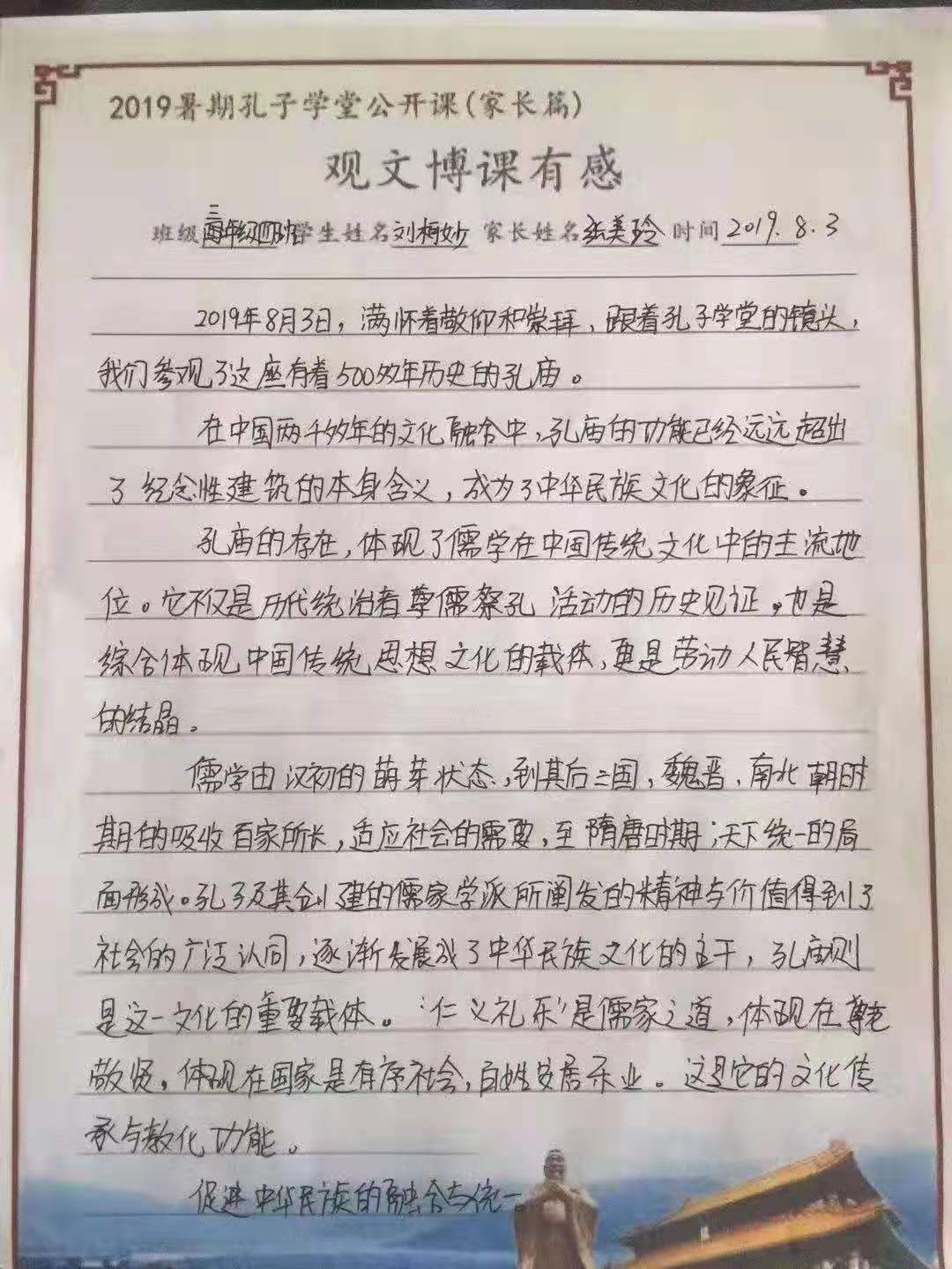 课程上线,好评如潮,不少学生、家长、老师纷纷留言评论。许多学生还撰写了观后感,他们表示,文庙的宏大令人震撼,身入其中不由的对传统文化肃然起敬;如此方便的就可以学习到各类传统文化知识,丰富了暑期生活的同时也提升了自身内涵。![]()