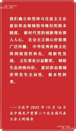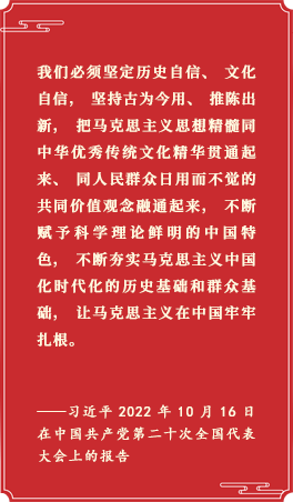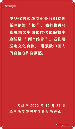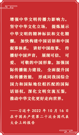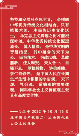 党的二十大报告指出,“把马克思主义思想精髓同中华优秀传统文化精华贯通起来”,“坚持创造性转化、创新性发展”,“深化文明交流互鉴,推动中华文化更好走向世界”。 [详细]