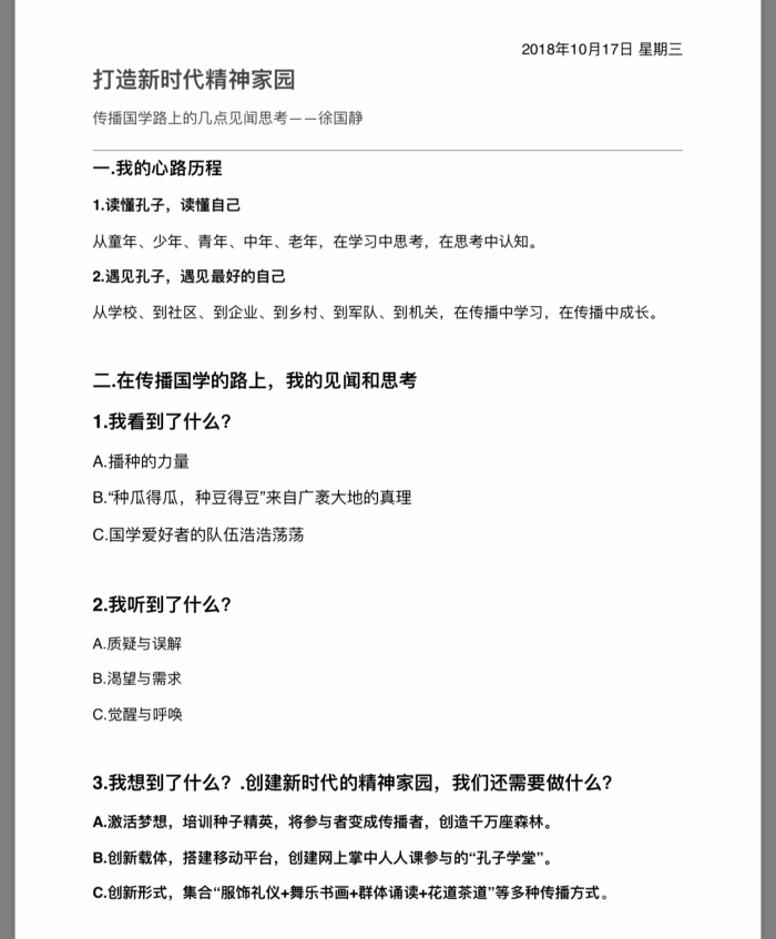在习近平总书记视察曲阜五周年之际,为促进孔子思想与时代发展、社会关切、百姓需求的深度融合,推动大型公益文化品牌“孔子学堂”的健康发展,进一步提升“孔子学堂”的内容建设和内涵提升,“孔子学堂创新发展培训班”会议于10月17日至20日在济南隆重召开。著名教育家、文化大使、全国中小学孔子学堂联席会主席徐国静带来讲座《打造新时代中国人的精神家园》。
