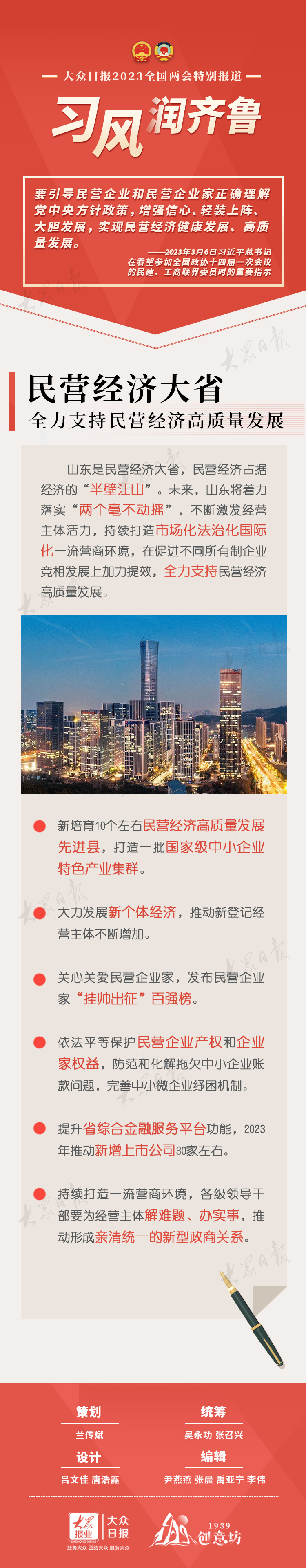 山东是民营经济大省,民营经济占据经济的“半壁江山”。未来,山东将着力落实“两个毫不动摇”,不断激发经营主体活力,持续打造市场化法治化国际化一流营商环境,在促进不同所有制企业竞相发展上加力提效,全力支持民营经济高质量发展。
