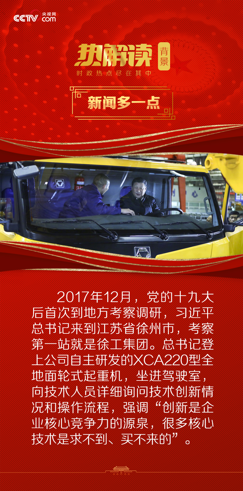 “创新是企业核心竞争力的源泉,很多核心技术是求不到、买不来的。”牢记总书记的叮嘱,单增海所在的徐工集团斩荆棘、克险阻,走出了一条自主摸索、技术引进、自主创新的发展之路。