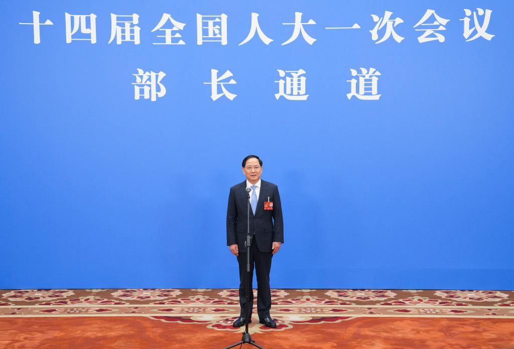 진좡룽(金壯龍) 중국 공업정보화부(공신부) 부장(장관)이 5일 열린 제14기 전국인민대표대회(전인대) 제1차 회의 첫 '부장 통로(部長通道)' 인터뷰에 응하고 있다. (사진/신화통신)