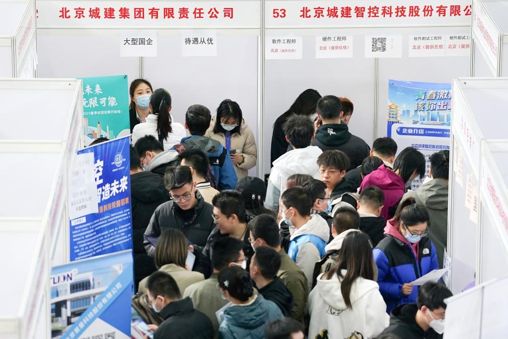 취업 준비 중인 대학생들이 지난 1일 베이징정보과학기술대학에서 열린 채용설명회에서 채용 정보를 알아보고 있다. (사진/신화통신)