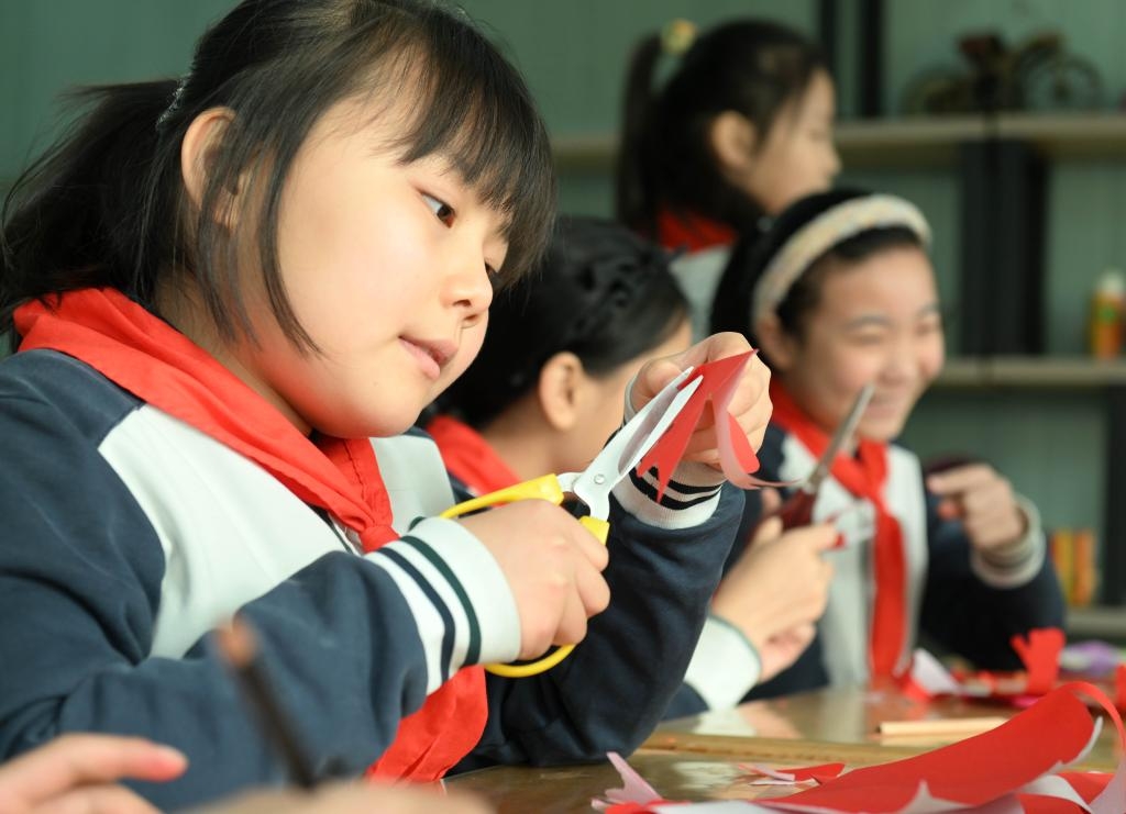 허베이(河北)성 스자좡(石家莊)시 소재 한 초등학교 학생들이 지난달 28일 무형문화재 수업에서 전지(剪紙·종이 공예) 공예를 배우고 있다. (사진/신화통신)