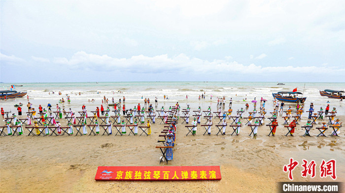 图为在广西东兴氵万尾金滩上的京族独弦琴百人弹奏表演。(无人机照片) 中新社发 黄天福 摄