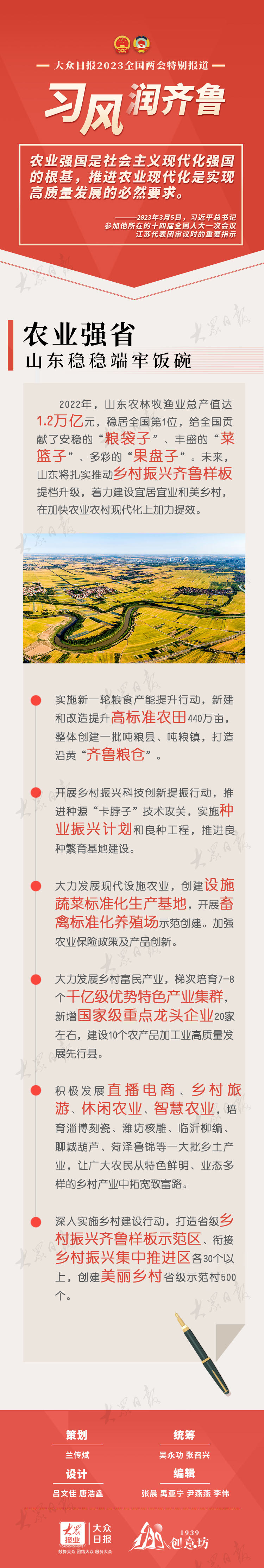 2022年,山东农林牧渔业总产值达1.2万亿元,稳居全国第1位,给全国贡献了安稳的“粮袋子”、丰盛的“菜篮子”、多彩的“果盘子”。未来,山东将扎实推动乡村振兴齐鲁样板提档升级,着力建设宜居宜业和美乡村,在加快农业农村现代化上加力提效。