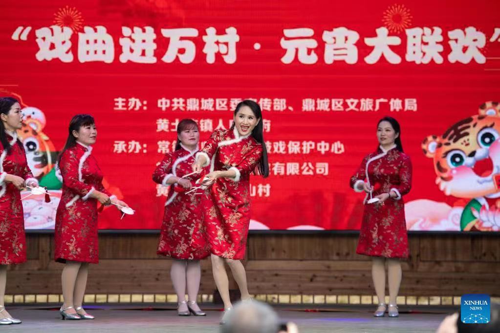 Du Meishuang (2nd R) stages a performance during an event promoting Huagu Opera at the grassroots level in Yunfengshan Village, Huangtudian Township, Dingcheng District of Changde City, central China's Hunan Province, Feb. 15, 2022. "As a grassroots cultural artist, what can I do for the people?" Du Meishuang, a deputy to the National People's Congress (NPC) and deputy director of the Huagu Opera Protection Center of Dingcheng District, Changde City, Hunan Province, always asks herself this question to motivate herself.