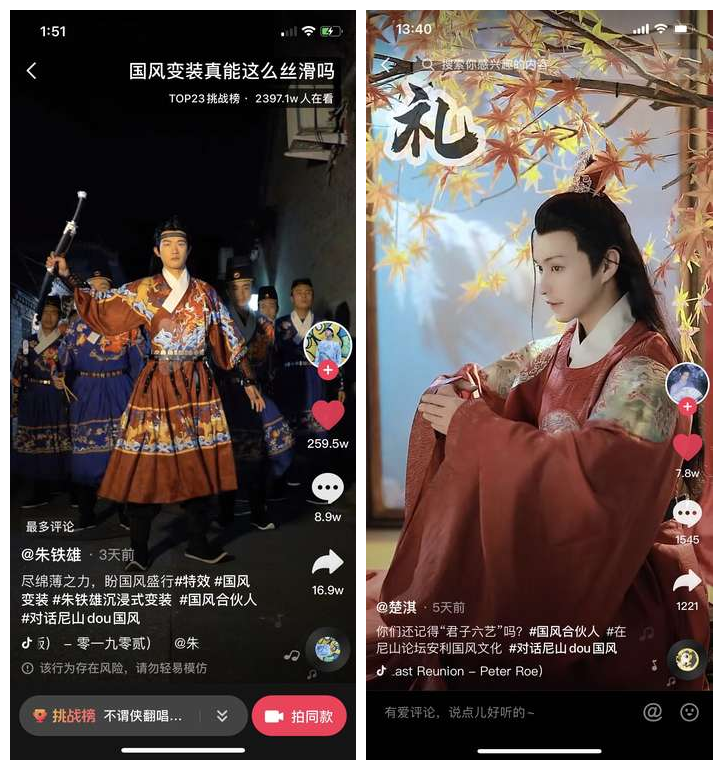 传播中华传统文化、秀出国风,成为青年人的一种时尚和潮流。本次官方话题上线,便吸引了抖音平台上国风达人们的参与,达人们通过变装,安利国风,重现中华传统文化。国风创作者@朱铁雄,结合抖音特效丝滑变装孙大圣、二郎神等经典传统神话角色,并创意碰撞戏曲装扮长山赵子龙,驾驭自行车钢铁坐骑,最后是全员变装汉服走出国风气势,单条视频播放量过亿,登上抖音热点top10,这条视频的文案写到“尽绵薄之力、盼国风盛行”,吸引8.9万网友留言称赞。2750万粉丝的国风达人@小橙子,通过变装演绎了敦煌飞天舞蹈,美轮美奂;850万粉丝的国风达人@楚淇变装为“礼、乐、射、御、书、数”的造型,惊艳表达了“六艺”,圈粉一片。网友@我们一起大声笑留言说,全世界都在讲中国话,孔夫子的话越来越国际化;网友@米线说,那些古人可能想都想不到,21世纪的生活如此美好。达人@冰冰手拿书卷,一副“腹有诗书气自华”的优雅顿时浮现眼前,网友@叶秋说,姐姐,中国风好样的!