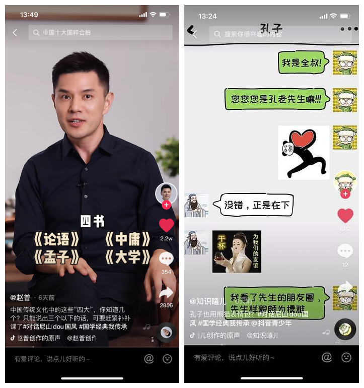 除了国风达人的变装玩法,来自抖音青少年的10余位国学、诗词、人文类达人,精准面向青少年,创新解读传统文化,轻松诙谐科普孔子的生平和成就。其中,@小小朱历史课创作了短视频《那些年被误会的孔子》,以动漫的形式解读了“历史上的孔子是啥样”,300多位粉丝热情互动;@知识磕儿创作了《熊猫表情包岂止我们在用,孔子也在用》,以动画的形式,与孔子微信嗨聊;@杨藩 大学美术老师 趣讲艺术创作了《孔子像的密码》,从解读孔子画像的视角讲“孔子故事”,让粉丝直呼“涨知识”。