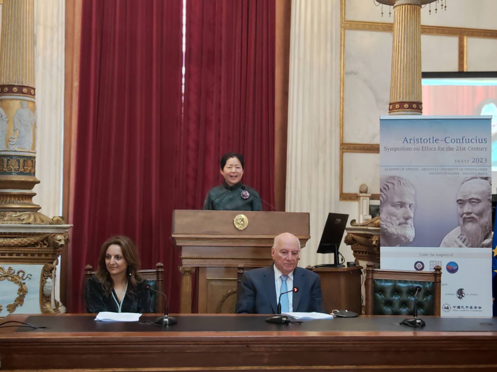 国承彦全程用英文致辞。在致辞中,她首先代表联合主办方——中国孔子基金会,对本次论坛的召开表示祝贺,并向中国驻希腊大使馆为推动孔子—亚里士多德论坛做出的努力表示感谢。她表示,孔子和亚里士多德是中希众多先哲中最具代表性的思想巨擘,本次论坛让两位伟大哲学家的思想交融会通,他们的智慧必将继续指引人类走向更美好的未来。中国孔子基金会成立近40年来,始终致力于传承儒家思想,推动中华优秀传统文化创造性转化、创新性发展,下一步将加强与雅典科学院、联合国可持续发展解决方案网络等研究机构合作,在推动世界不同文明互鉴上做出新贡献。她说,今年是孔子诞辰2574周年,每年9月28日孔子诞辰日都会举办国际孔子文化节和尼山世界文明论坛,今年的尼山世界文明论坛的主题是“全人类共同价值与人类命运共同体——加强文明交流互鉴共同应对全球挑战”。国承彦向与会代表发出诚挚邀请,欢迎各位代表共赴尼山,共话文明、共叙友谊。
