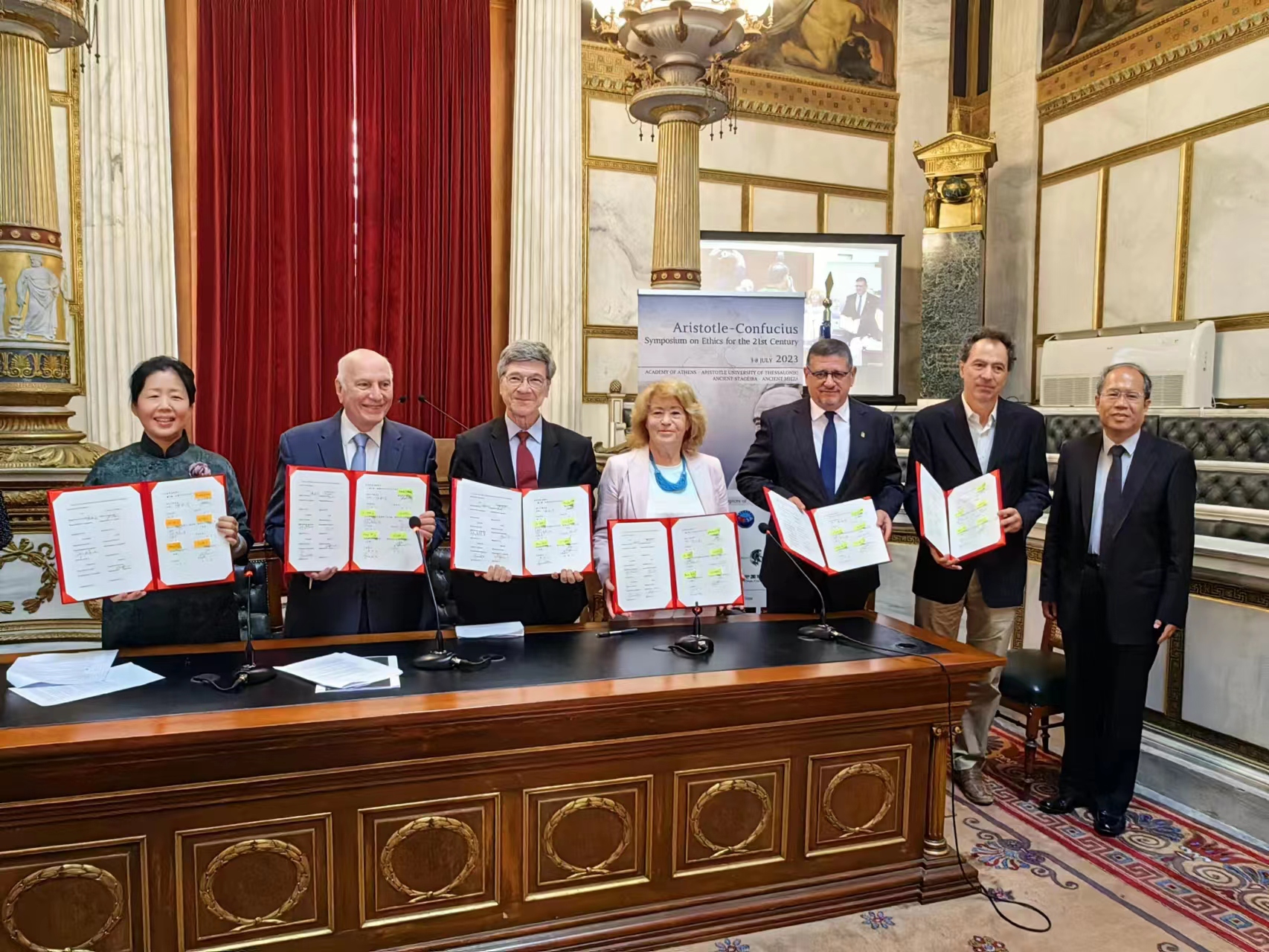 开幕式上,中国孔子基金会与联合国可持续发展解决方案网络、雅典科学院、雅典经济与商业大学、雅典娜研究与创新中心、亚里士多德大学亚里士多德跨学科中心等五家机构签署了框架性合作协议,约定每年在中国或希腊轮流举办孔子—亚里士多德论坛,加强学术交流。