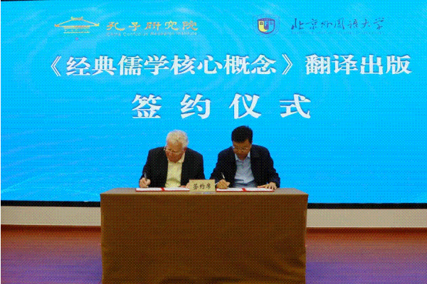 安乐哲为清华大学人文学院、北京外国语大学中华文化国际传播研究院、曲阜师范大学孔子文化研究院赠书,并与孔子研究院副院长袁汝旭共同签署“孔子研究院翻译中国”系列图书:《<经典儒学核心概念>翻译出版技术服务合同》。双方从翻译出版、文化建设等方面达成合作协议,推动孔子思想更好地走向世界。