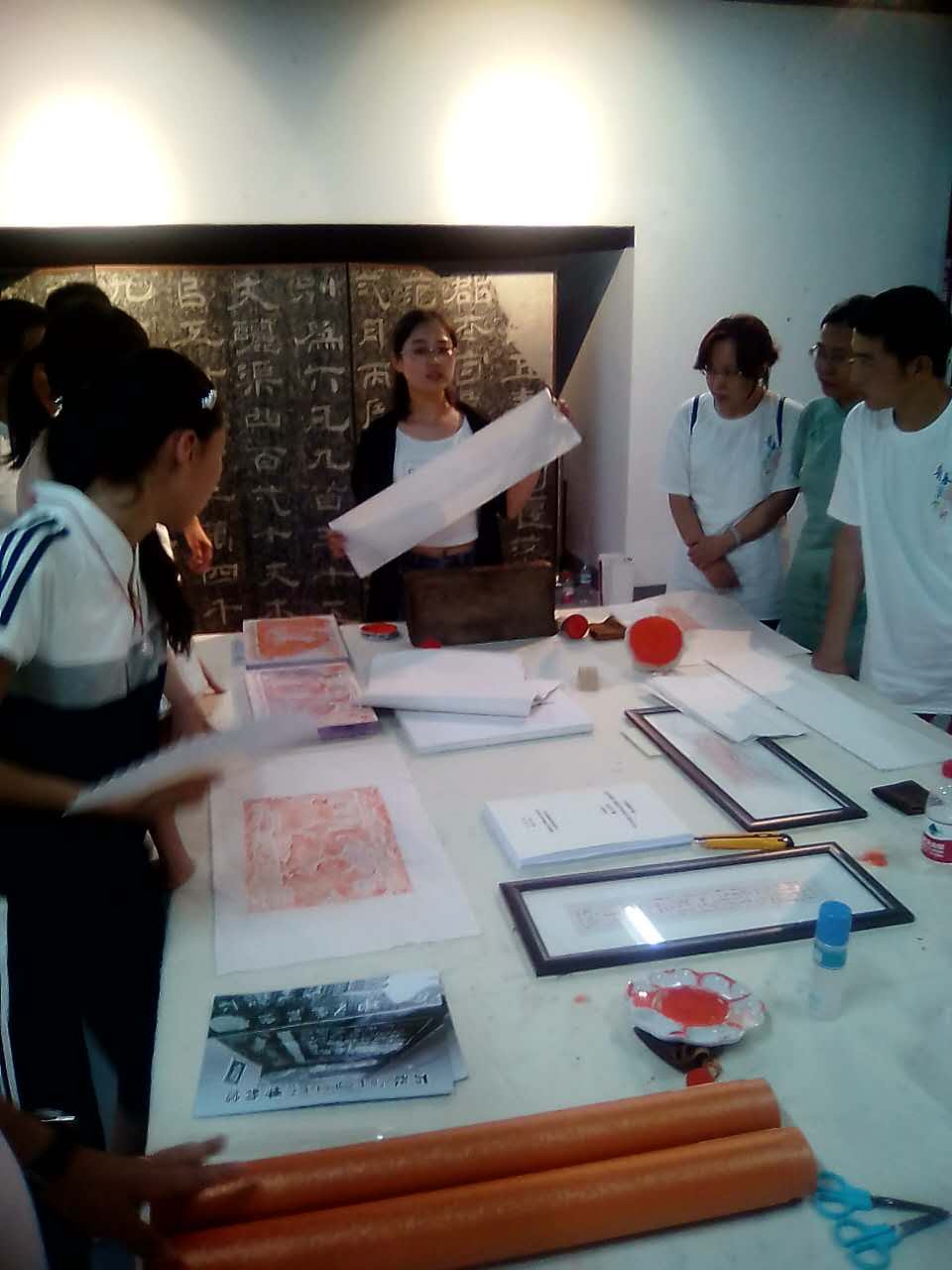 博物馆许杰老师为大家讲解传拓的制作工艺,以孔子六艺图案为拓本,现场演示并指导大家制作孔子拓片。