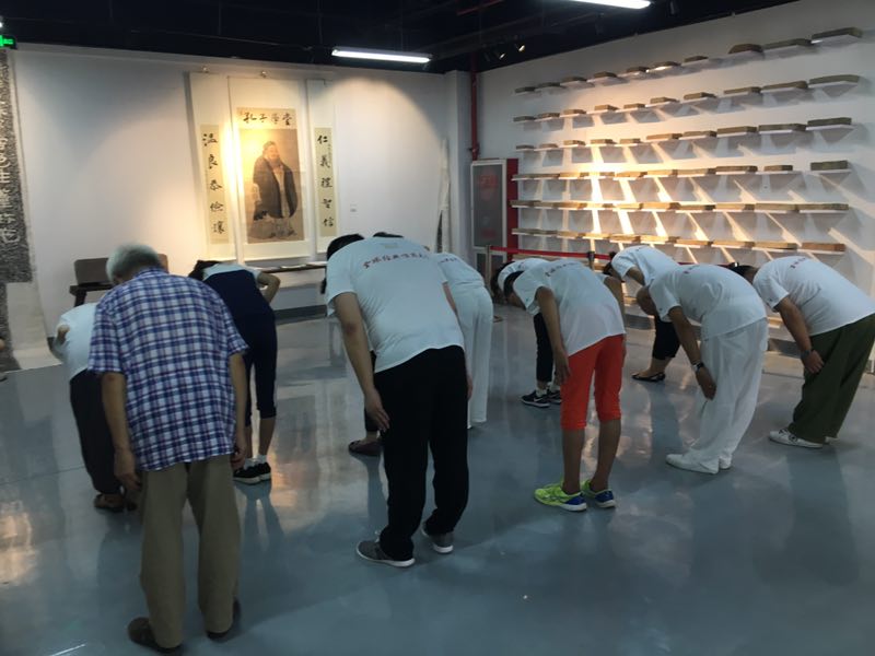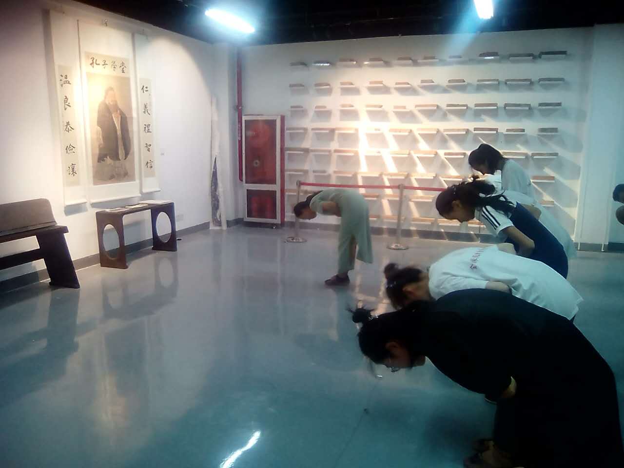 致敬先师,礼拜孔子。在石敢当摩崖艺术馆孔子学堂内,李文殊老师为大家讲解礼拜孔子的礼仪规范,并带领大家端身正仪,以崇敬之心向孔子画像行三鞠躬礼。