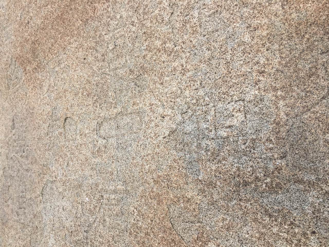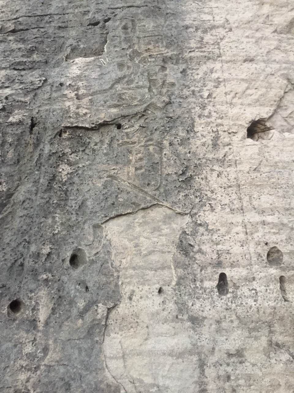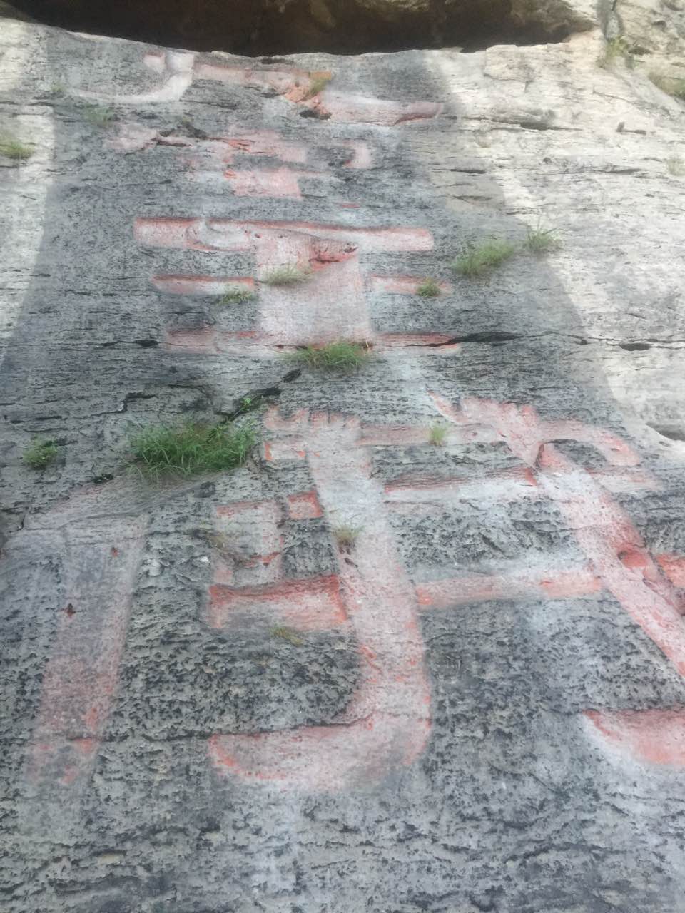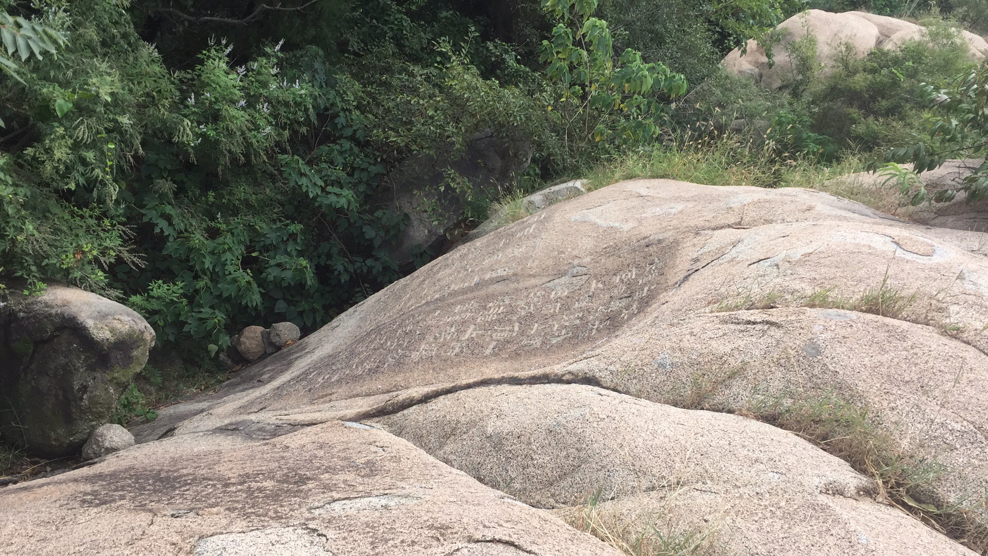 此岩石名为片麻岩,上面的刻经距今1500年历史,据张教授介绍由于这类岩石质地不够坚硬,受到腐蚀,易脱落,所以且看且珍惜吧……