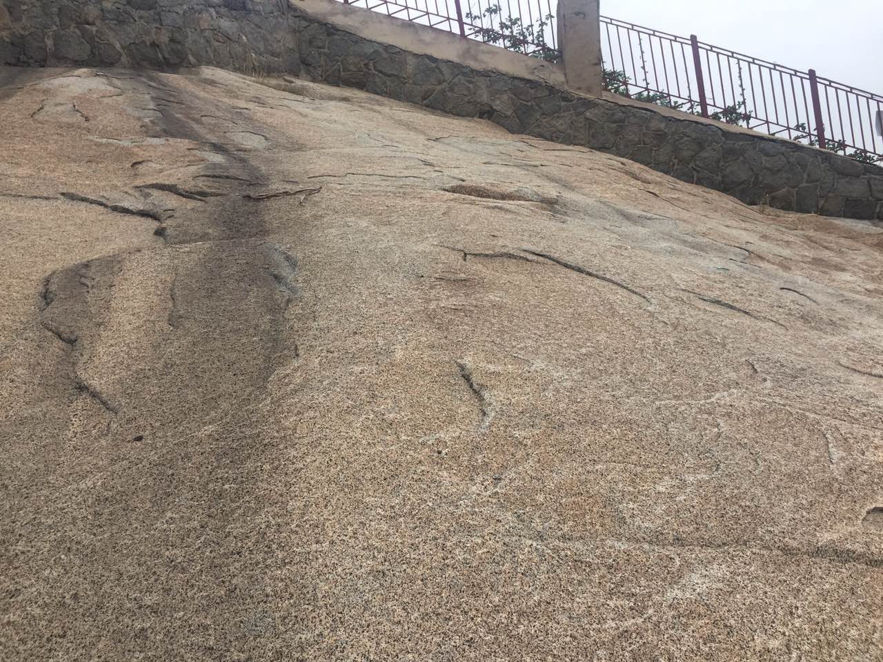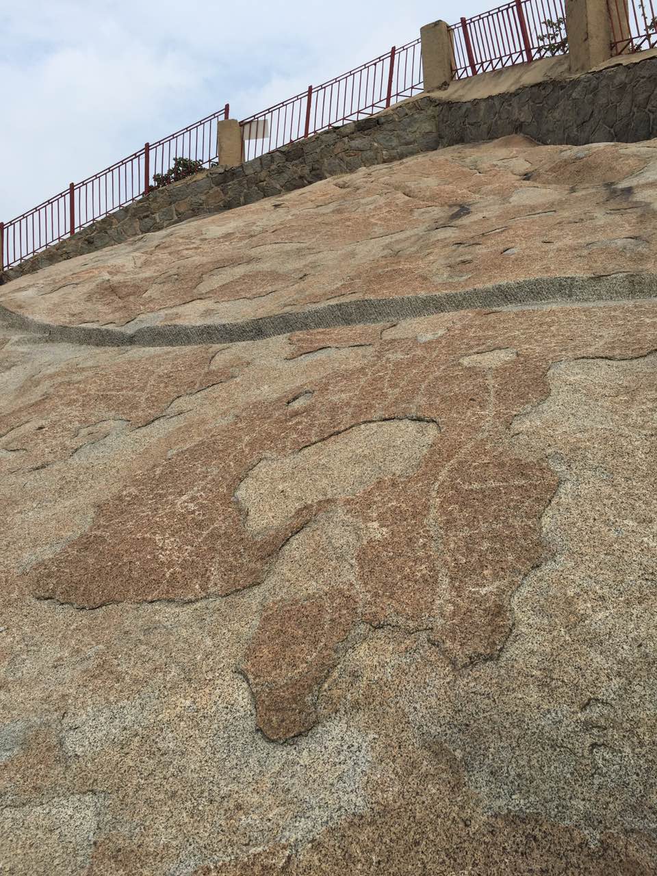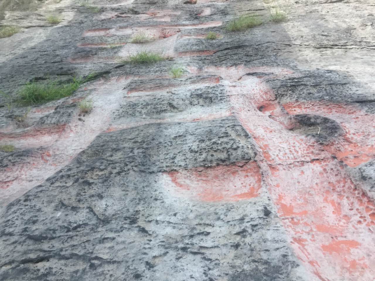 此岩石名为片麻岩,上面的刻经距今1500年历史,据张教授介绍由于这类岩石质地不够坚硬,受到腐蚀,易脱落,所以且看且珍惜吧……