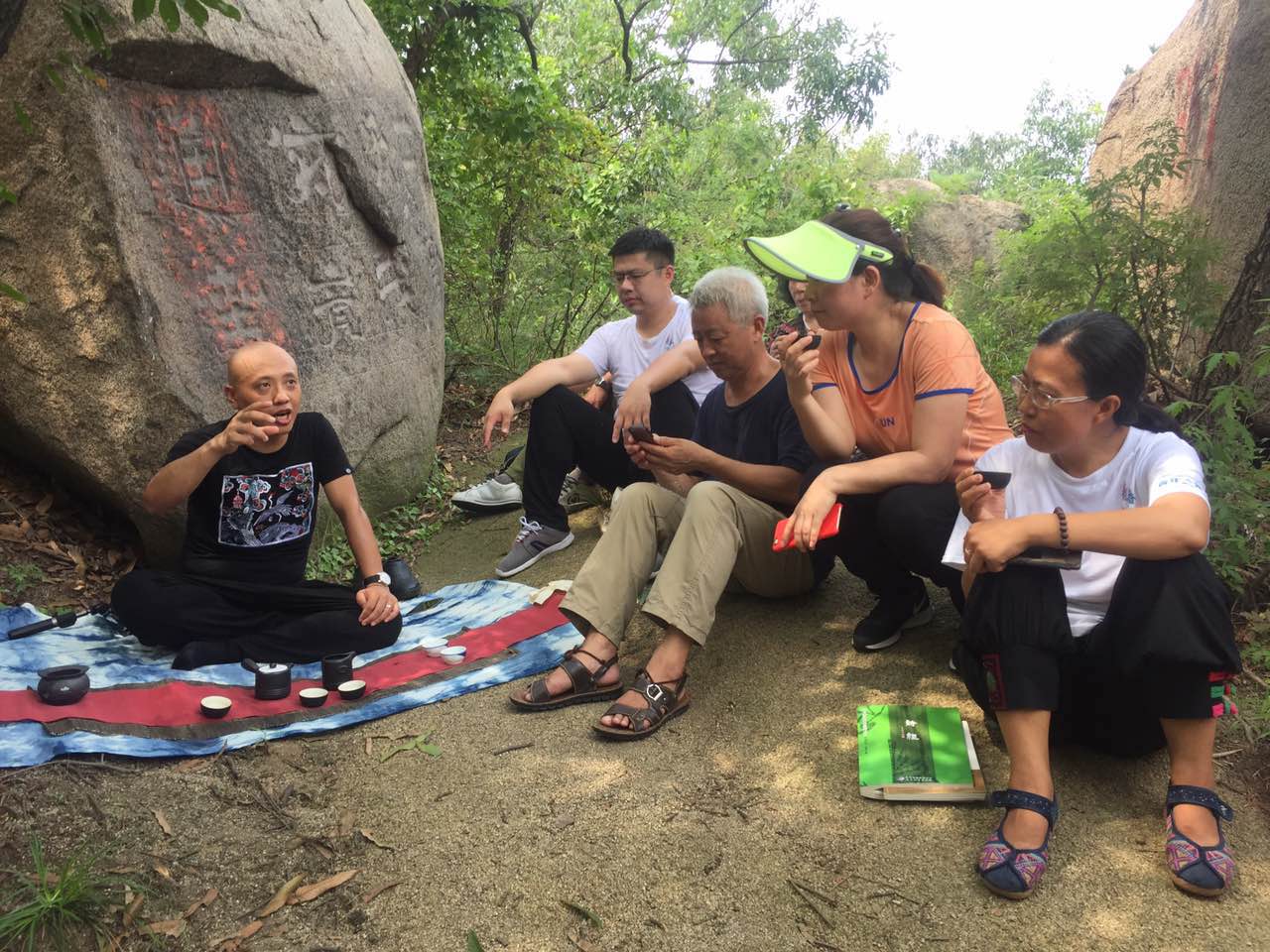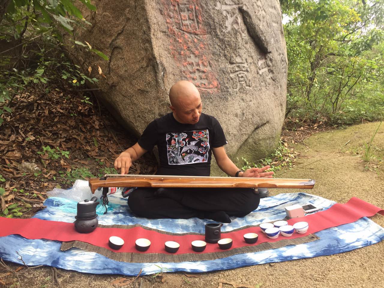 岗山比铁山要大,植物茂密,绿树成荫,有道教行宫在其中。行至此处,众人已略显疲惫。王馆长安排大家在此休息,准备茶歇为大家滋润身心,茶香悠悠,古琴弹起,甚是惬意。词曲曲名《仙翁操》,相传是孔子最喜欢听的古琴曲。