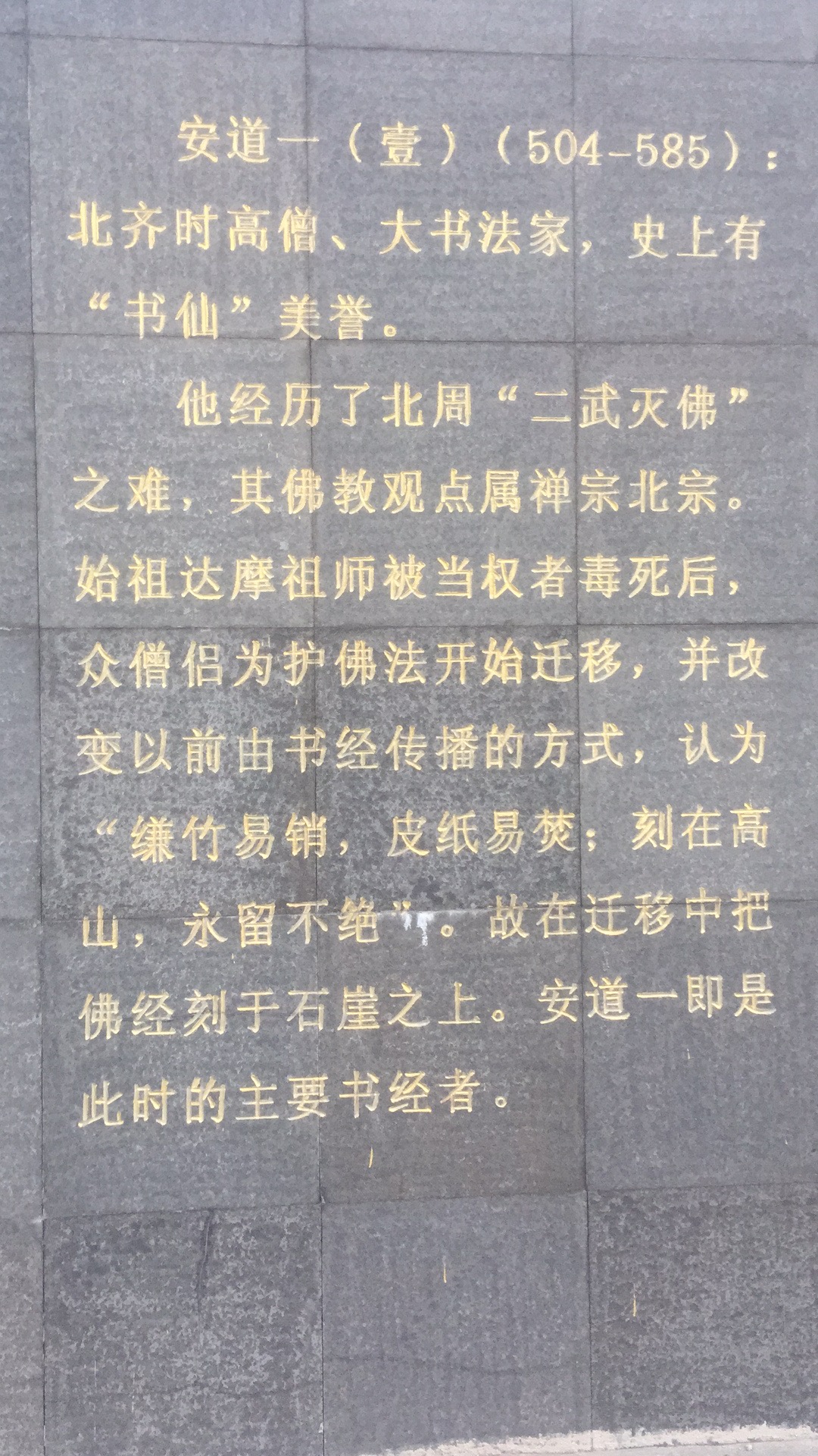 闻名国内外的洪顶山摩崖刻经,位于山东省泰安市东平湖北岸。自从1989年发现以后,已有不少国内外著名专家学者慕名而来,观看刻经。它的发现,对解开史学界的“安道一”之谜,对研究这位视史传经体大书法家的身世、经历及中国文字从“隶”到“楷”的转变具有关键作用和史料价值。
