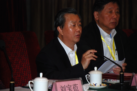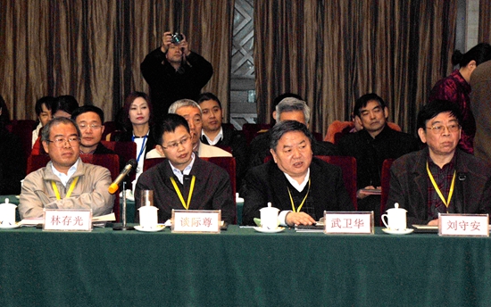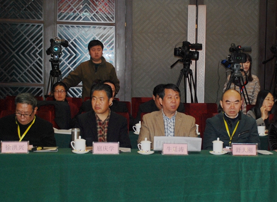 中国孔子基金会副理事长牛廷涛(右二)及专家舒大刚、扈庆学在座谈会上。