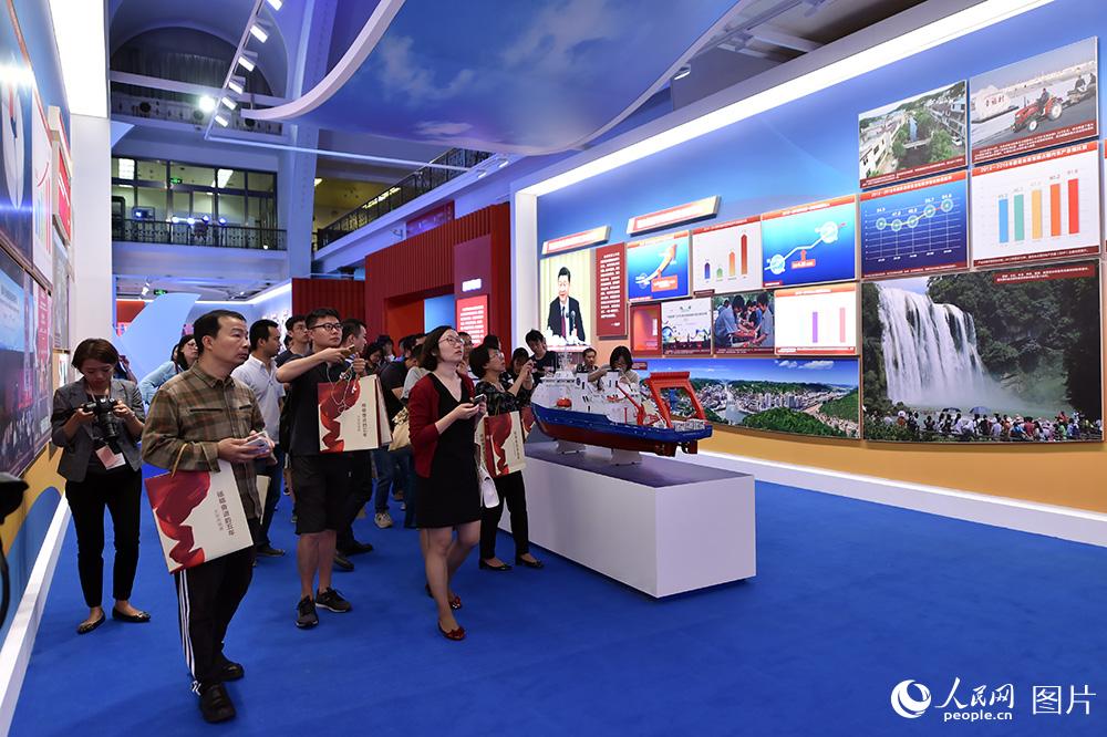 展览安排设计了“序篇”“践行新发展理念 引领经济发展新常态”“坚持中国特色社会主义政治发展道路 推进国家治理体系和治理能力现代化”“坚定文化自信 创造中华文化新辉煌”“以人民为中心 增进群众获得感”“绿水青山就是金山银山 迈入社会主义生态文明新阶段”“实现强军目标 建设世界一流军队”“丰富‘一国两制’实践 推进祖国统一”“推动构建人类命运共同体 谱写中国特色大国外交新篇章”“全面从严治党 确保党始终成为伟大事业的坚强领导核心”等10个主题内容展区和1个特色体验展区,全面宣传展示党的十八大以来党和国家事业发生的历史性变革。(人民网记者 翁奇羽 摄)