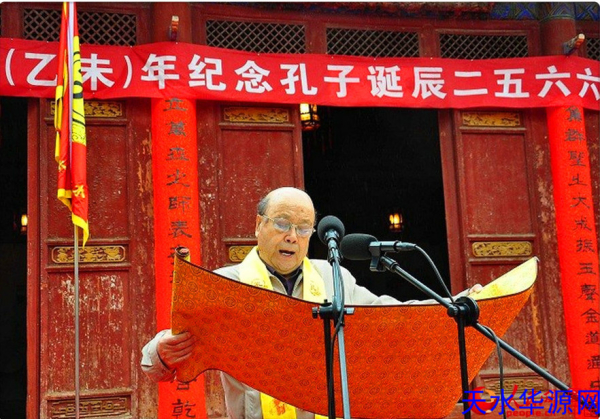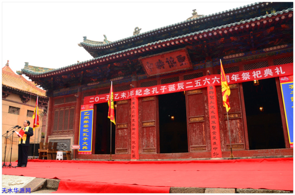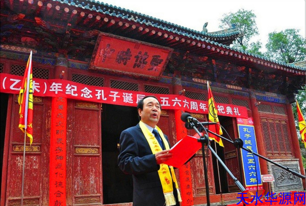 2015年9月28日上午,天水市举行纪念孔子诞辰2566周年祭祀典礼。本次祭祀活动由天水孔子文化研究学院主办。甘肃省政协原副主席周宜兴,天水市委常委、秦州区委书记雷鸣,市政协副主席、天水孔子文化研究学院院长安志宏等出席典礼。