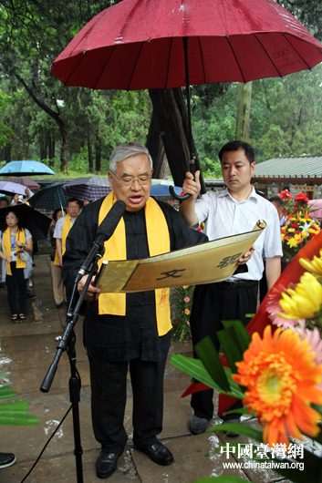 “情系齐鲁——两岸文化联谊行”台湾嘉宾团顾问、台湾世新大学讲座教授曾永义现场恭读祭文。(中国台湾网 芮益芳 摄)