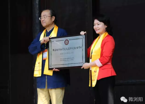 2015年上午9点15分,文庙大成门关闭。门前两侧各站立着54名学生,手捧竹简,诵读《论语》。伴着朗朗书声,身佩绶带的嘉宾们整理衣冠,庄严肃立。国家级非物质文化遗产——浏阳文庙祭孔音乐授牌仪式开始,全国政协委员、非遗保护专家田青教授授牌并发表讲话。
