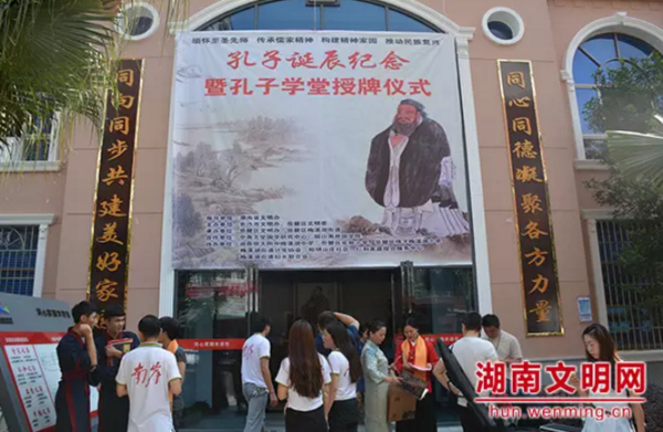 2016年9月28日,是中国至圣先师孔子诞辰日。为了“弘扬传统文化,传承儒家精神”,缅怀这位中华文化思想的集大成者,在孔子诞辰纪念日来临之际,长沙市岳麓区在梅溪湖街道阳明山庄社区举行孔子诞辰2567周年纪念活动。湖南省文明办副主任熊科文,中南大学国学研究中心主任、博士生导师刘立夫,以及湖南师大附中梅溪湖中学、岳麓区实验小学、博才梅溪湖小学师生代表以及附近居民和国学爱好者出席参加了祭孔仪式。