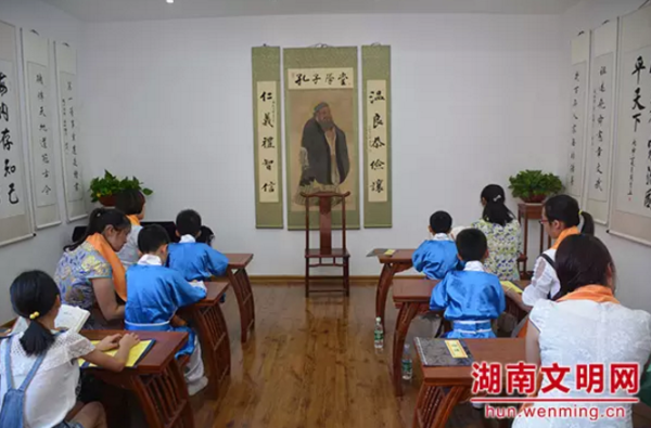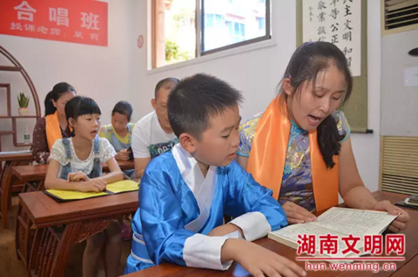 社区孔子学堂的“亲子诵读经典”课。图片来源:湖南文明网